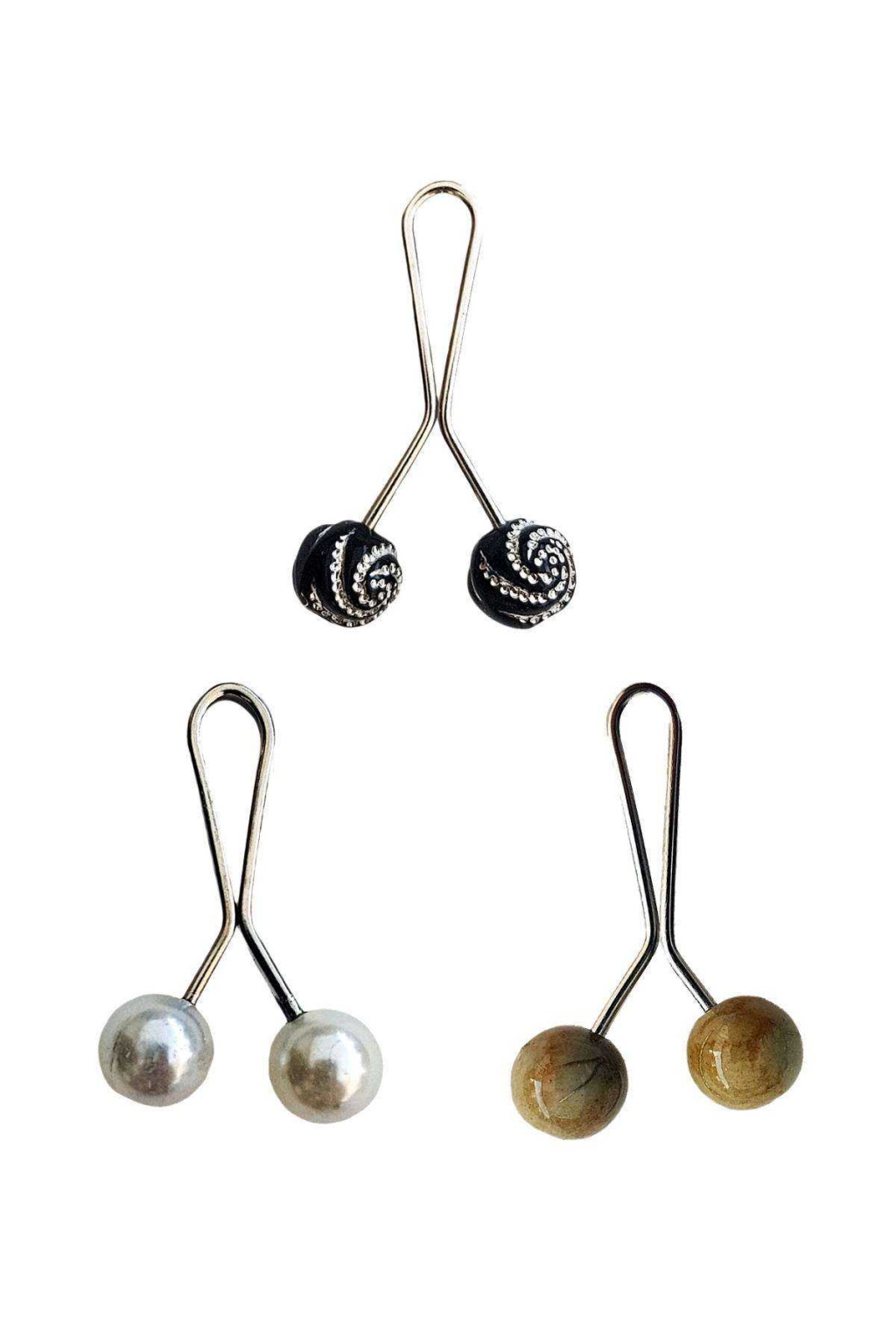 3 Adet Tesettür Eşarp ve Şal Klipsi İnci Beyaz Hardal Siyah Desenli