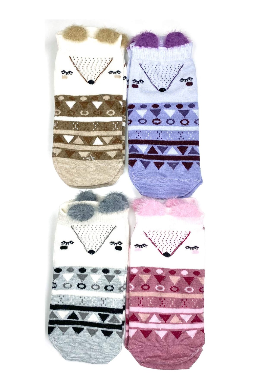 4 Çift Yumuşak Ponpon 3 Boyut Kulaklı Desenli Pamuklu Kadın Bilek çorap