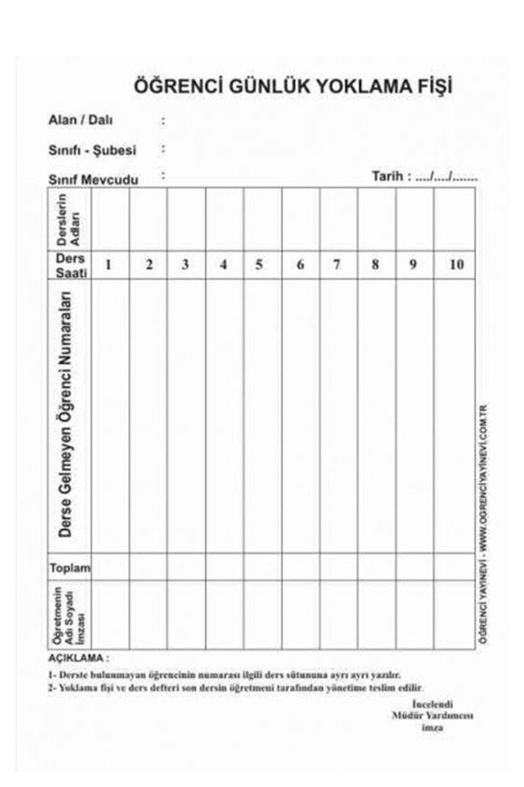 Kocaoluk Yoklama Fişli Ders Defteri 10 Derslik