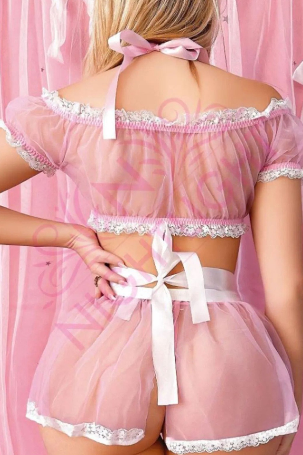 Night Light Kadın Pembe Transparan Önlüklü Pembe Hizmetçi Kostümü 7040