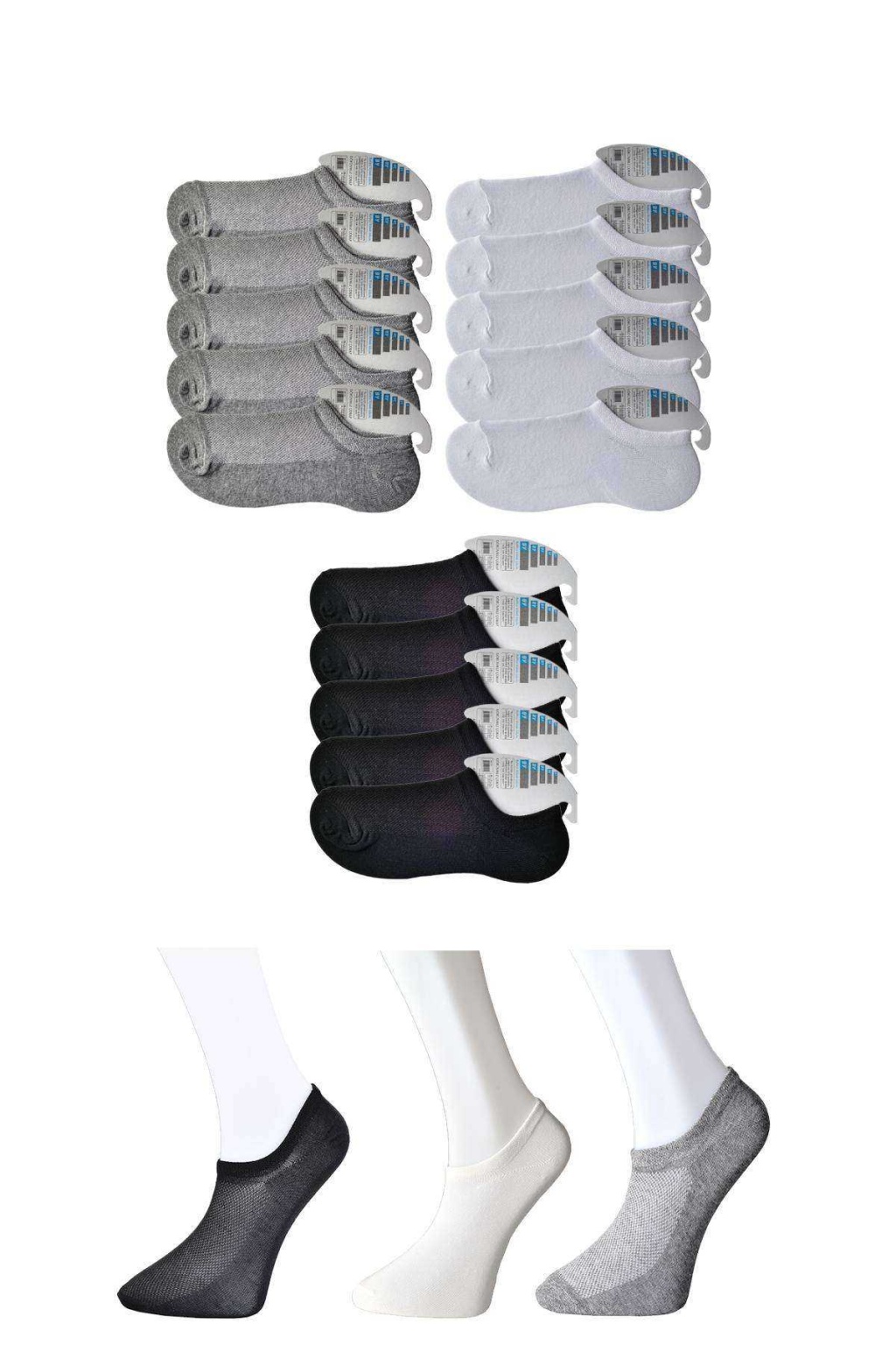 Siyah Gri ve Beyaz Erkek Görünmez Çorap 15 çift